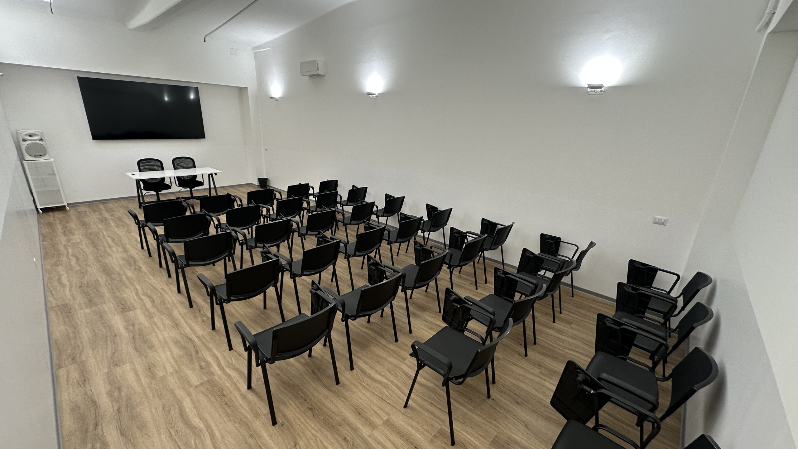 - Allestimento a banco scuola, tavola rotonda, platea con ribaltina, ferro di cavallo
